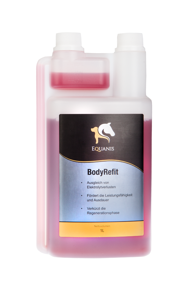 BodyRefit ist ein flüssiges Ergänzungsfuttermittel, das Elektrolyte in hochwertiger Form liefert und besonders schnell vom Körper aufgenommen wird. Es ist völlig zuckerfrei, um eine schonende Fütterung zu gewährleisten.