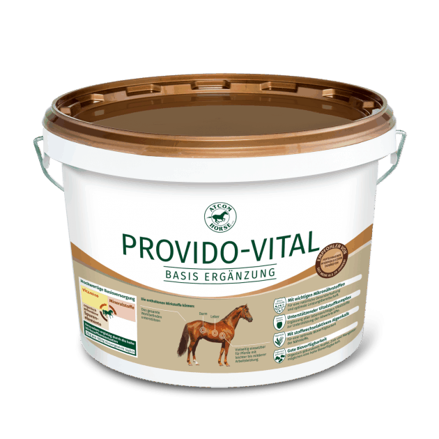 Atcom PROVIDO-VITAL versorgt somit das ausgewachsene Pferd mit allen Mineralstoffen die unerlässlich für den Stoffwechselprozess und zahlreiche Körperfunktionen sind. Zusätzlich bringt Atcom PROVIDO-VITAL alle lebenswichtigen Spurenelemente (Eisen, Kupfer, Zink, Mangan, Selen und Jod) in die Ration. Um eine optimale Bioverfügbarkeit dieser wichtigen Spurenelemente im Organismus des Pferdes zu schaffen, ist eine gezielte Kombination aus anorganischen und organisch gebundenen Spurenelementen enthalten. Eine wichtige Voraussetzung, damit diese lebenswichtigen Schlüsselsubstanzen, die für die Funktion zahlreicher Enzyme und Hormone verantwortlich sind, auch vom Organismus des Pferdes genutzt werden können. Atcom PROVIDO-VITAL versorgt das Pferd weiterhin mit den Vitaminen A, D3, C und E sowie mit den stoffwechselaktivierenden B-Vitaminen und Biotin. Atcom PROVIDO-VITAL ist daher eine gute Basis-Ergänzung mit Vitalstoffen und kann vielfältig in der Pferdefütterung eingesetzt werden. Für Pferde mit erhöhtem Anspruch, gesundheitlichen oder leistungsbedingten Besonderheiten empfehlen wir die Zufütterung unserer gezielten Kurprodukte Atcom HUF-VITAL®, ATCOM CHAMPION-VITAL, Atcom JUNIOR-VITAL, Atcom SENIOR-VITAL oder Atcom ALLERGO-VITAL.