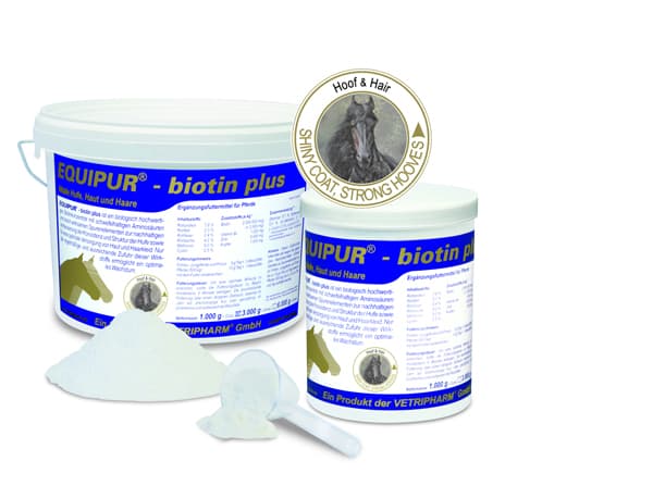 Zur äußerlichen Unterstützung eignet sich besonders EQUIPUR-chevaloxin; EQUIPUR - dermaloxin ist eine pflegende Hautsalbe. Allgemeine ernährungswissenschaftliche Erkenntnisse: Biotin - ist ein Biowuchsstoff, dem eine zentrale Bedeutung für die Gesunderhaltung von Huf, Haut und Haaren zukommt. Biotin reguliert den Verhornungsprozeß in der Haut und den Haaren, festigt die Struktur des Hufhorns (Wand, Trachten, Sohle, Strahl) und fördert das Hufwachstum.