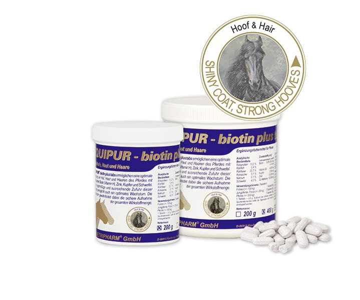 EQUIPUR - biotin plus tabs ermöglicht eine umfassende und einfache Versorgung des Pferdes mit Biotin (Vitamin H), Vitamin B6, schwefelhaltigen Aminosäuren, Kupfer und Zink. Durch das Zusammenspiel dieser Wirkstoffkomponenten wird die Regenerationsfähigkeit der Hautzellen optimiert und somit die Geschmeidigkeit und Widerstandskraft der Haut erhöht. Gleichzeitig wird das Haar durch die Verbesserung der inneren Struktur gekräftigt und geschützt. Die Zunahme der Hornqualität letztlich bringt dem Huf Festigkeit und Elastizität. Hufe, Haut und Haare sind wegen ihrer ständigen Erneuerung ganz besonders auf eine regelmäßige und ausreichende Zufuhr mit dafür notwendigen Biokatalysatoren angewiesen. Daher sollte die Anwendungsdauer von Biotin bei sämtlichen Problemen des Hufes (Risse, Spalten, lose Wände), bei zu weichem Hufhorn, bei mangelhaftem Hufwachstum oder bei Hautproblemen und Haarverlust mindestens 6-12 Monate betragen.