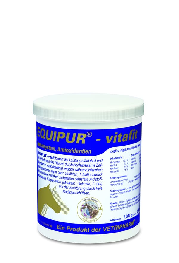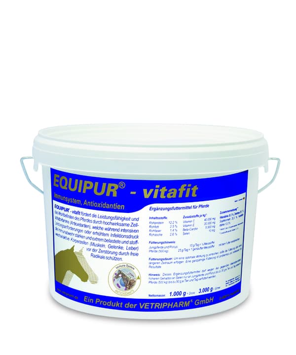 EQUIPUR - vitalfit ist ein Futterzusatz für Pferde mit den Zellschutzvitaminen C, E und Beta-Carotin sowie Selen.